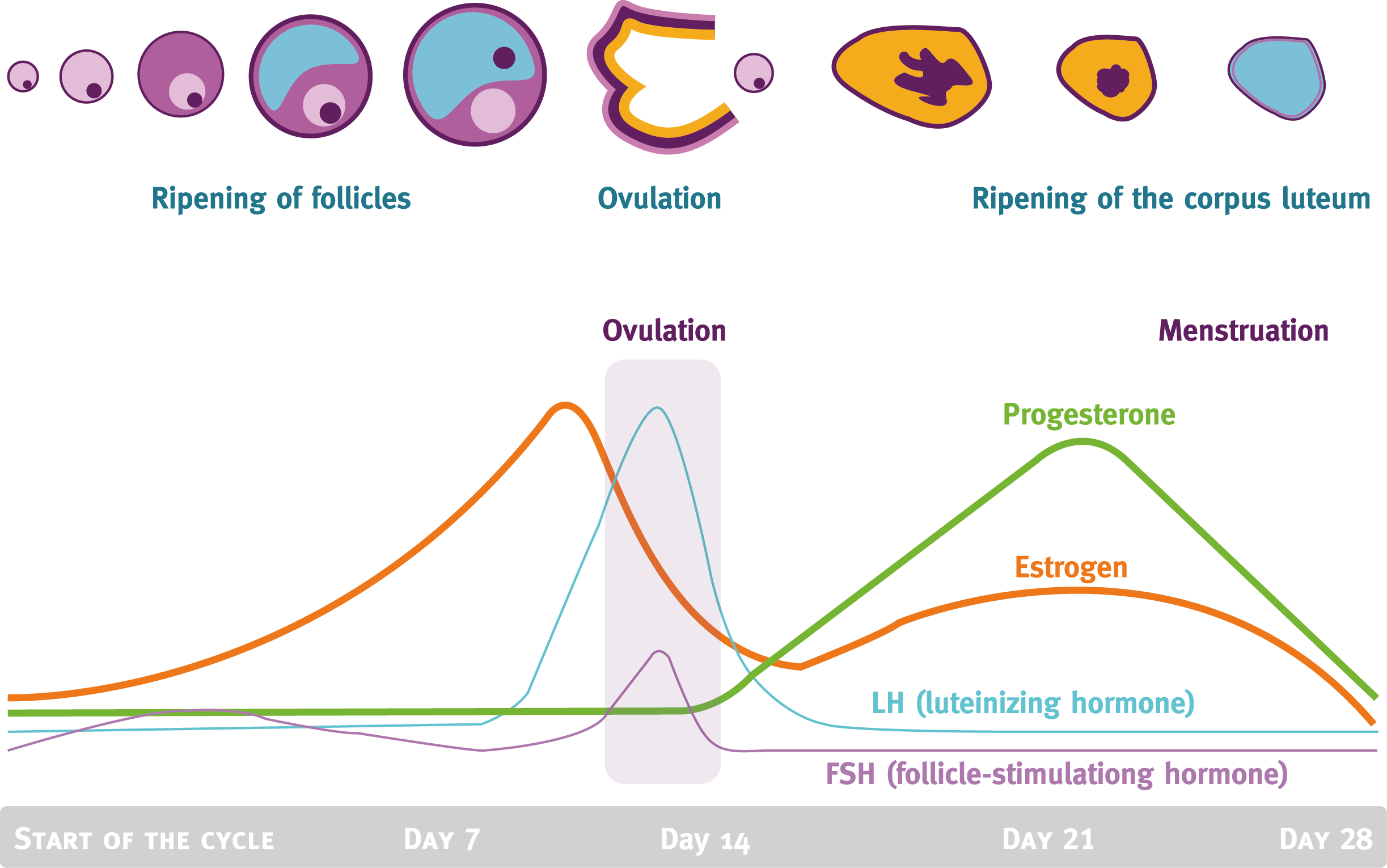 Durante la follicologenesi, FSH e LH sostengono crescita e maturazione dei follicoli. L’FSH stimola i follicoli a produrre estrogeni; quando gli estrogeni superano una certa soglia, scatta un feedback negativo che riduce l’FSH.